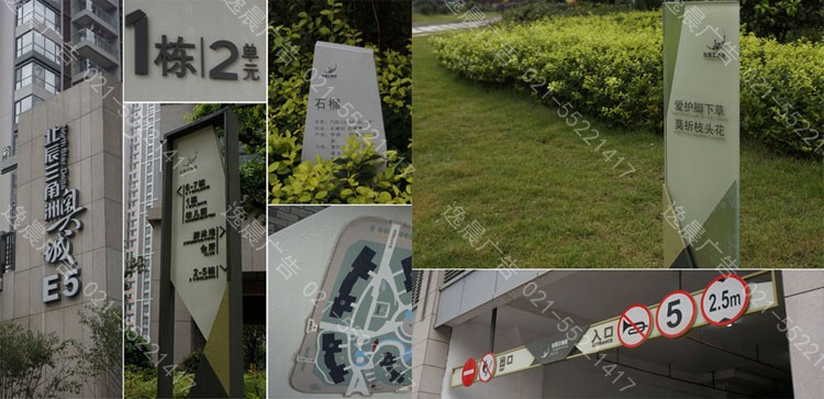房地产标识、导视系统中房地产LOGO标识为第一要素,选材:不锈钢发光字。 房地产导视系统为内容主体。包括:立牌标识、门牌、指示牌以及地下车库索引。