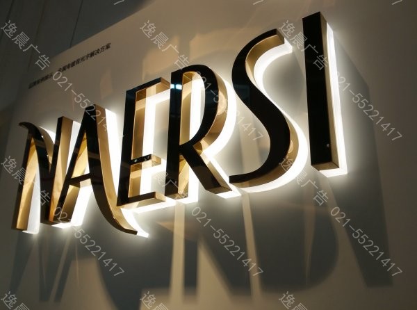不锈钢背光字是最常见的背光字之一,分拉丝不锈钢字与镜面不锈钢字之分,但多是采用后面垫亚克力(切割成语不锈钢字体一样的字形),再在不锈钢空心字的里面装上任何颜色的LED灯制作而成。 不锈钢背光字制作主要是把3毫米以上厚度的透明的亚克力雕刻成和不锈钢字一样大小的亚克力字,然后把led灯用三秒胶或者玻璃胶把一连串led灯带粘到亚克力字上,最后把不锈钢字往透明亚克力字上一盖,字就做成了。也因此不锈钢背光字的光是由里向外散发出来的。