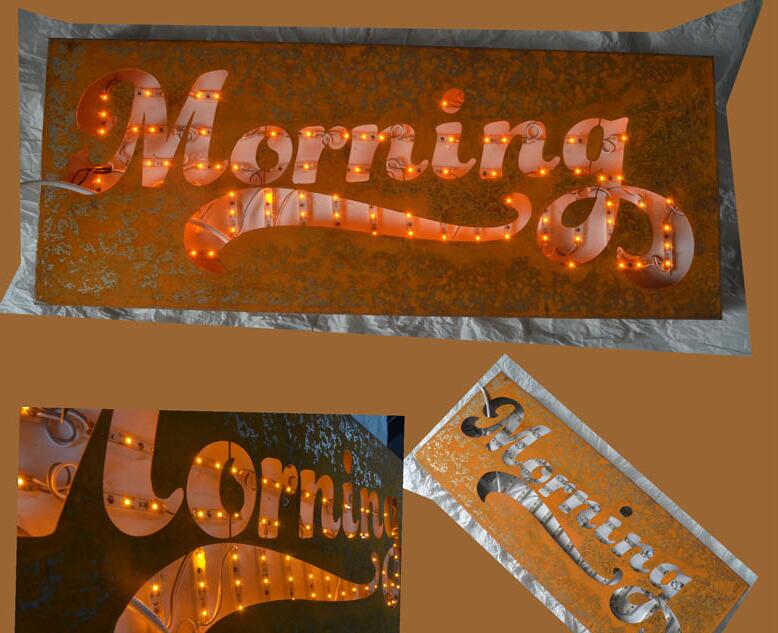 生锈仿古灯箱也叫铁锈灯箱(铁艺发光灯箱),它是用很厚的生锈铁板做灯箱体,通过雕刻镂空铁板成图案,内贴亚克力透光面板。内置LED光源,这和不锈钢烤漆灯箱原理一样,不同的是箱体采用生锈铁板,铁板采用自然生锈及化学处理。